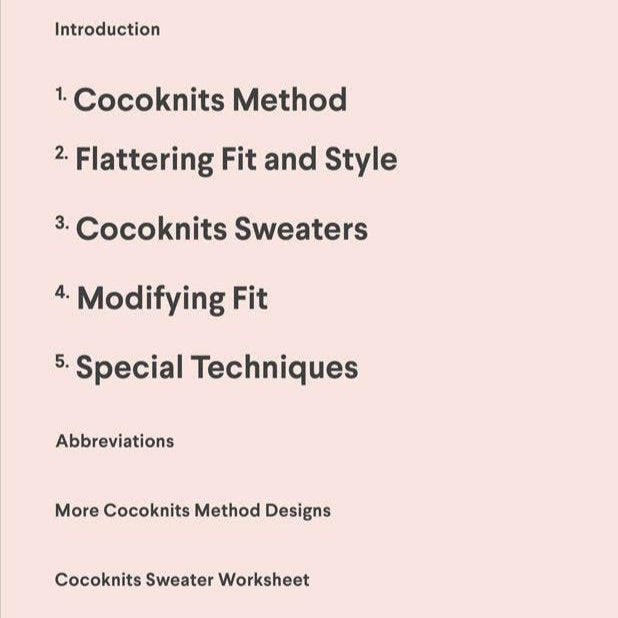 The Cocoknits Method is a system for knitting top-down, seamless sweaters with streamlined designs that can be customized for a perfect fit. The Cocoknits Method is a system of tracking knitting progress in your own customized worksheet. The tailored style of construction in these patterns creates truly three dimensional garments that impart a great fit upon completion. Designs are worked from the neckline down, so once the neck and yoke area are established, the knitter can just cruise through completing the sweater without worrying about counting or losing track of their place in the pattern. Another advantage of knitting top-down is the ability to try on your garment as you work, to ensure the fit is right.