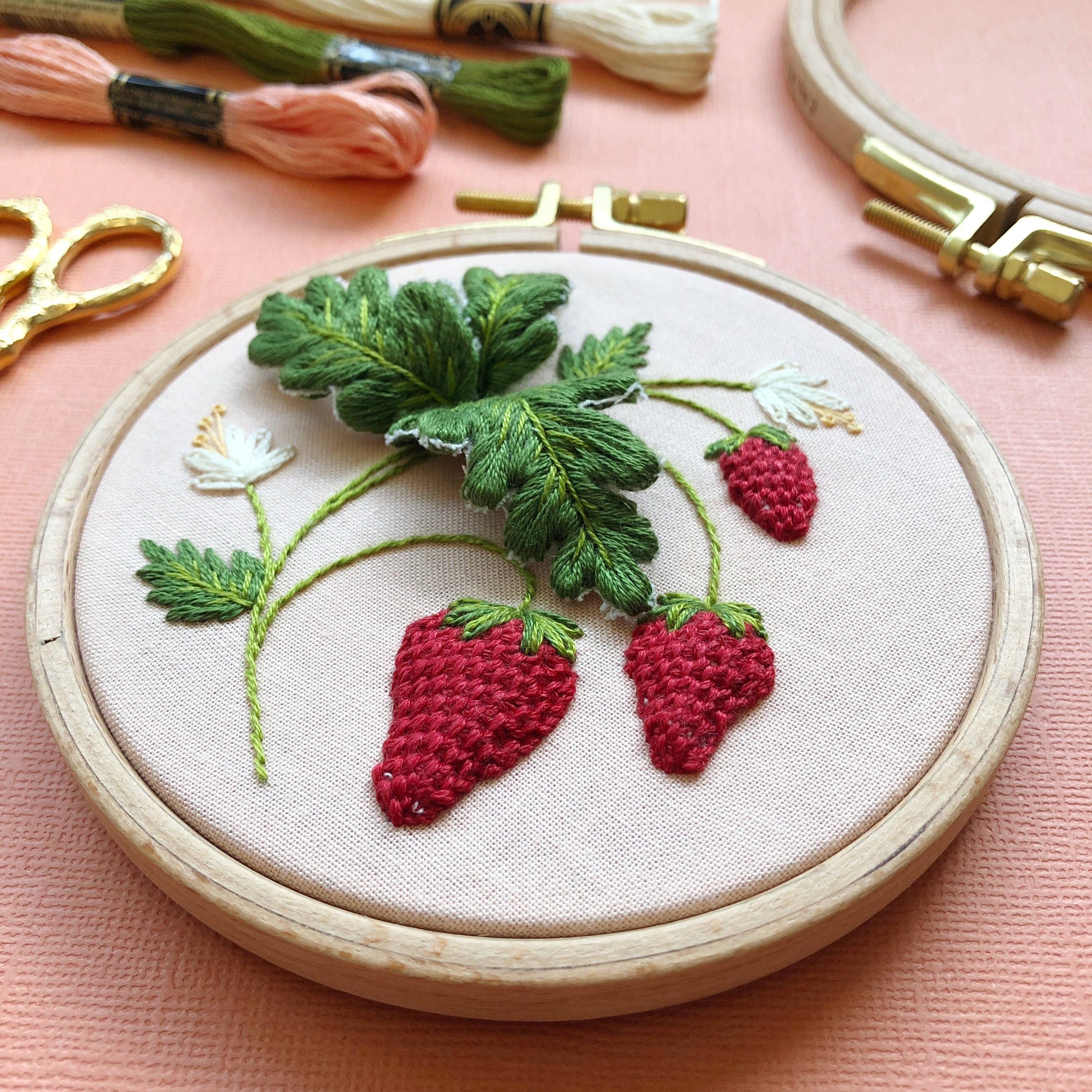 These delightfully ripe strawberries and moveable leaves are a playful way to learn stumpwork. Stumpwork is a type of textural embroidery that uses padding, wire, and textural stitches to create elements that stand away from the fabric creating 3D elements. In this hand embroidery kit you’ll learn how to make sculptural strawberries and leaves that stick out from the fabric. It is a fun technique to learn and add special elements to your embroidery projects
