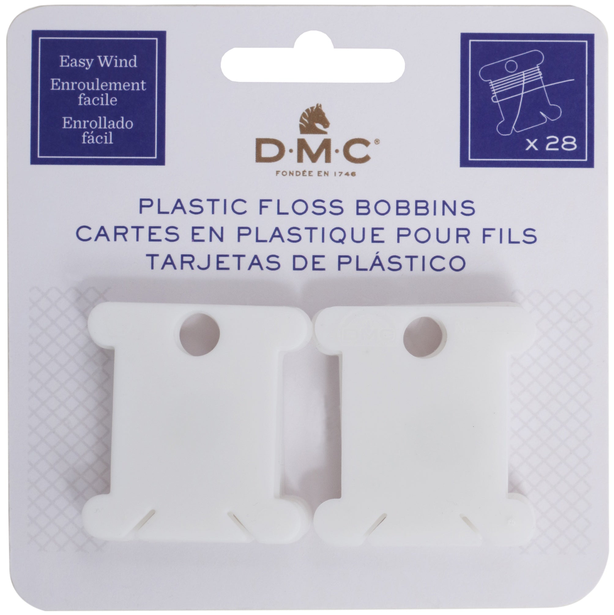 DMC-Plastic Floss Bobbins allow you to organize your thread for a project or create easy longterm storage. These plastic bobbins are easy to wind and feature an area to write the DMC color number on the front, as well as a hole for looping on a key ring. This package contains twenty-eight 1.5" x 1-.5" hard plastic floss bobbins.