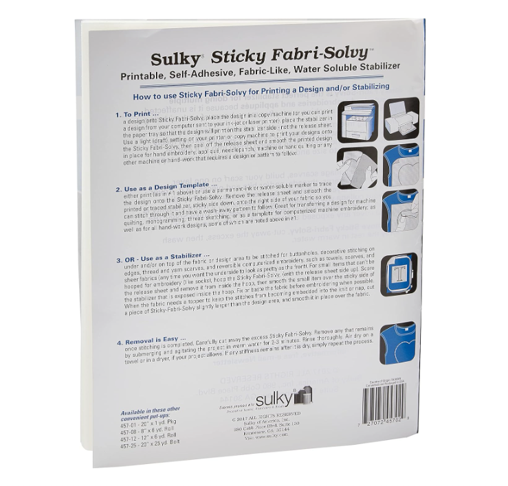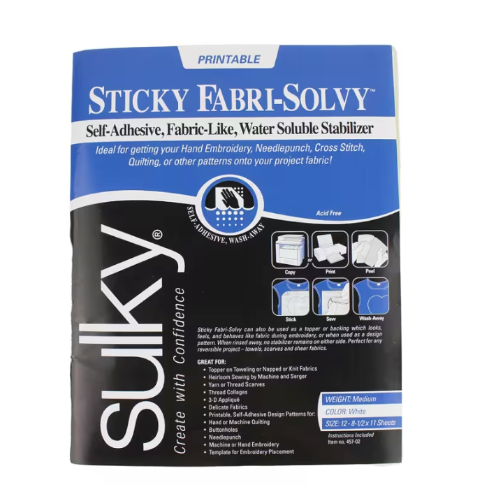 Sulky Sticky Fabri-Solvy Stabilizer combines the convenience of pressure-sensitive adhesive with the flexibility of a water soluble stabilizer! It is a printable, temporary self-adhesive, fabric-like stabilizer that is ideal for getting your hand embroidery, punch needle, cross stitch, quilting, or other patterns onto your project fabric.