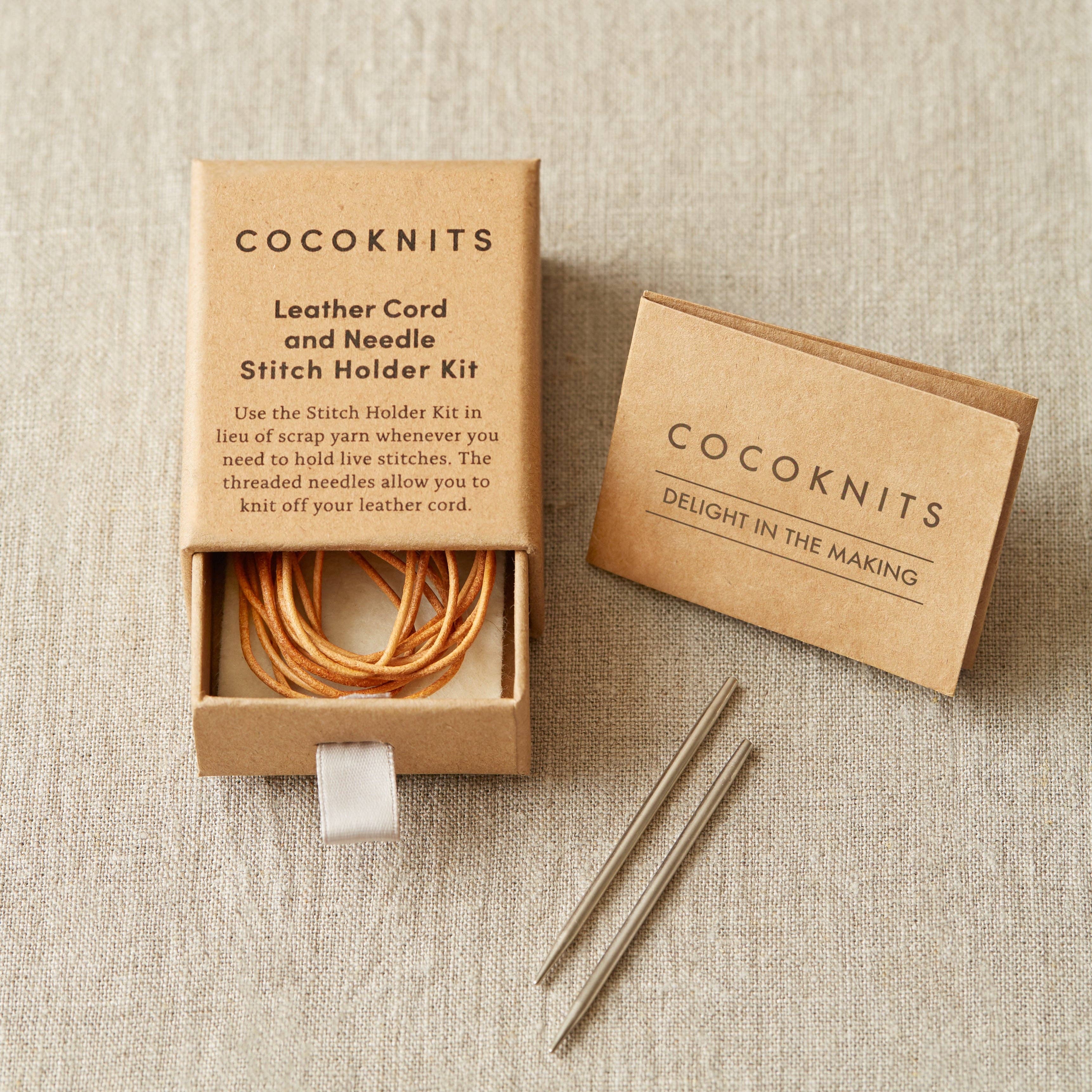 When knitting top-down, seamless sweaters, there comes a point when you need to take your sleeve stitches off onto a holder. Safety-pin type stitch holders don’t work for this. Scrap yarn works, but tends to slip up into the stitches, making the job of getting each stitch back onto a needle laborious. You can leave them on a spare circular needle or cord – but it’s challenging to have needles and cord hanging everywhere. We found that a leather cord had the flexibility of yarn, but was firm enough to keep the stitches from disappearing up into themselves. The interior-threaded needle means you can knit onto and off of the cord – like a leather circular needle. The needles screw onto, and off of, the leather cord.